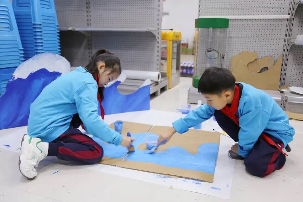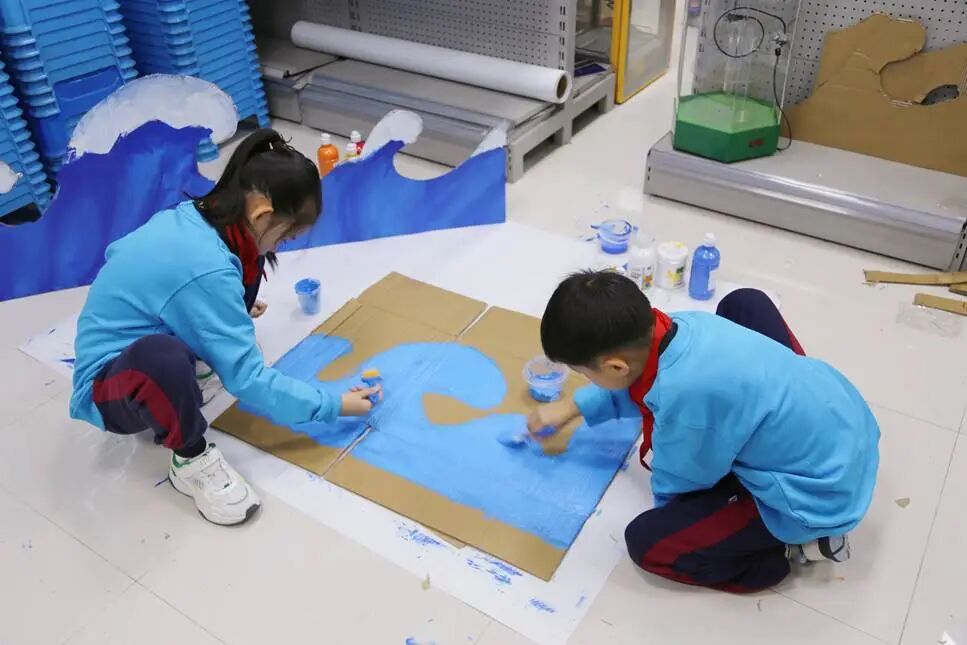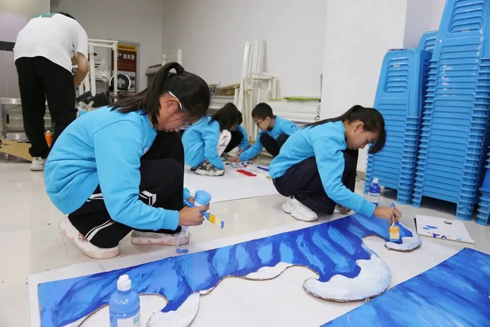 小朋友们收集日常生活中的可回收物品,共同完成 “大闸蟹 + 湖水” 的组装,它不仅仅是一个艺术品,更是一位‘气候守护者’,提醒我们要保护环境。